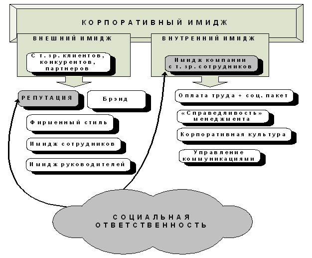 Как видно на рисунке, «облако» социальной ответственности накрывает, прежде всего, репутацию организации во внешнем мире и мнение сотрудников о своей организации (внутреннюю репутацию).